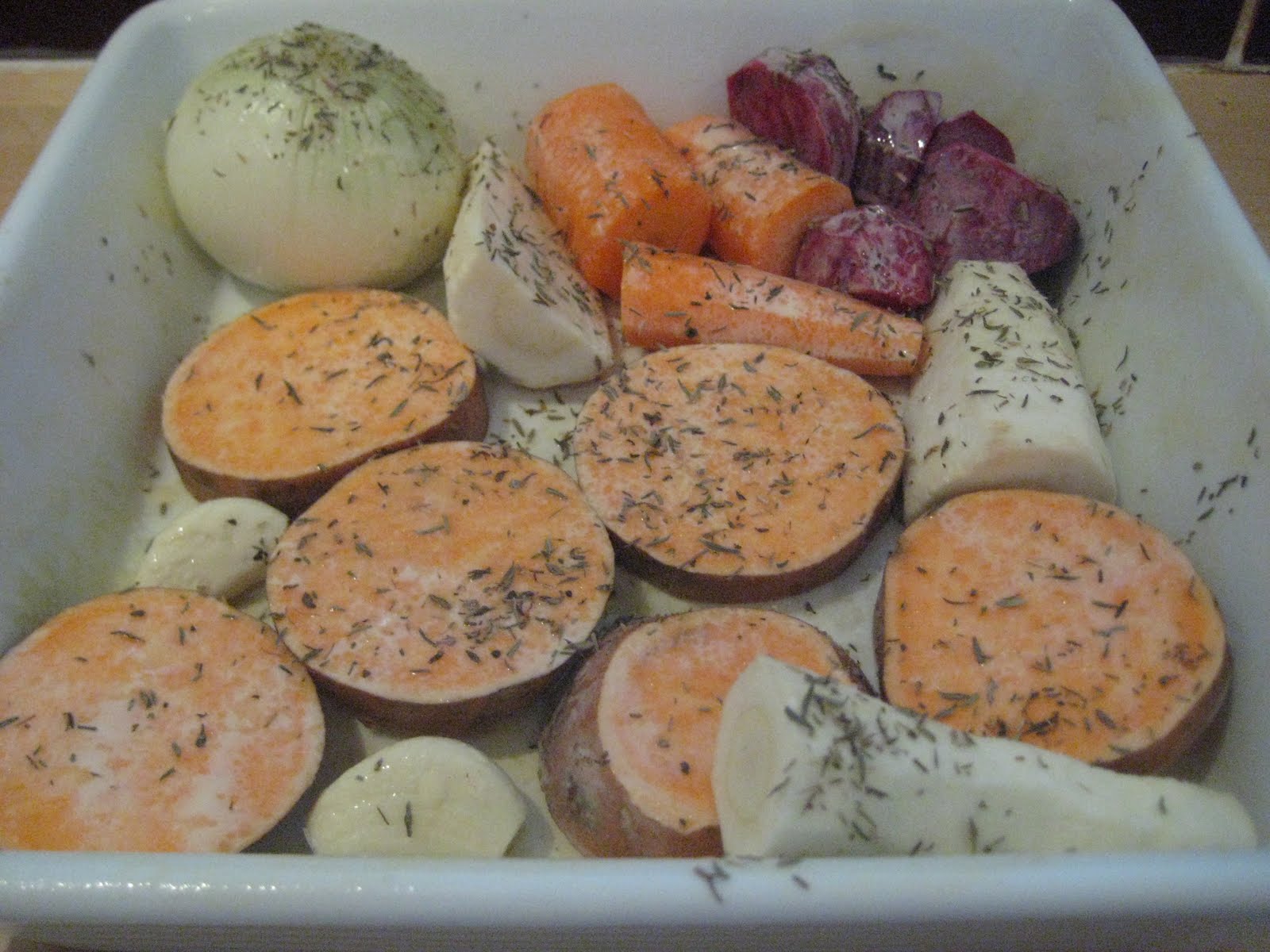roasted onion, parsnip, carrots, beetroot, sweet potato, and at the end i threw in a couple of mushrooms and baby corn